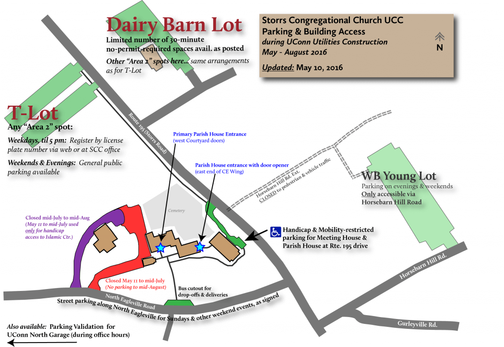 - Parking for Sunday will be available, as usual, in street parking along North Eagleville Road and in nearby UConn lots such as the ‘T-Lot’ next to the Towers dormitories, the Dairy Barn lot next to the “yellow barn”, and the WB Young Lot behind the agriculture quad. (Note that the lot behind the Floriculture building will also be closed for this project.) Worshippers with mobility limitations are encouraged to use the parking and driveway off Route 195 for worship.