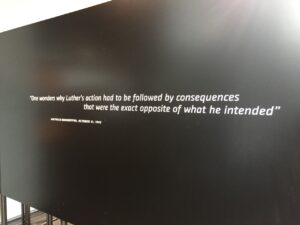 What was interesting about the exhibit, though, was how it highlighted that it wasn’t only Luther’s anti-Jewish piece that was appropriated. His overall identity and persona was used as a totem for the efforts of the Nazi regime. They portrayed him as an exemplar of the strong German Christian leader, the true-German’s German. They lifted up the Nazi’s program of strengthening and purifying German culture and society as the effort to “complete” the Reformation that Luther started. Luther anniversaries during the Nazi regime—the 450th of his birthday, the 400th of his publishing of the Luther Bible (Luther’s translation of the Bible from the original languages into German)—provided further opportunities to push the agenda under the guise of Luther’s legacy.