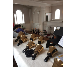 Have you ever wondered what it’s like to play hand bells? Come learn basic ringing techniques on bells and chimes this summer. On an informal basis, depending on who answers this ‘ad’, I will be hosting short sessions at convenient times for those with courage. A knowledge of rhythmic notation is helpful but you can also be taught. The ability to ‘name notes’ in treble and bass clefs is not necessary as we use a color-coded system.