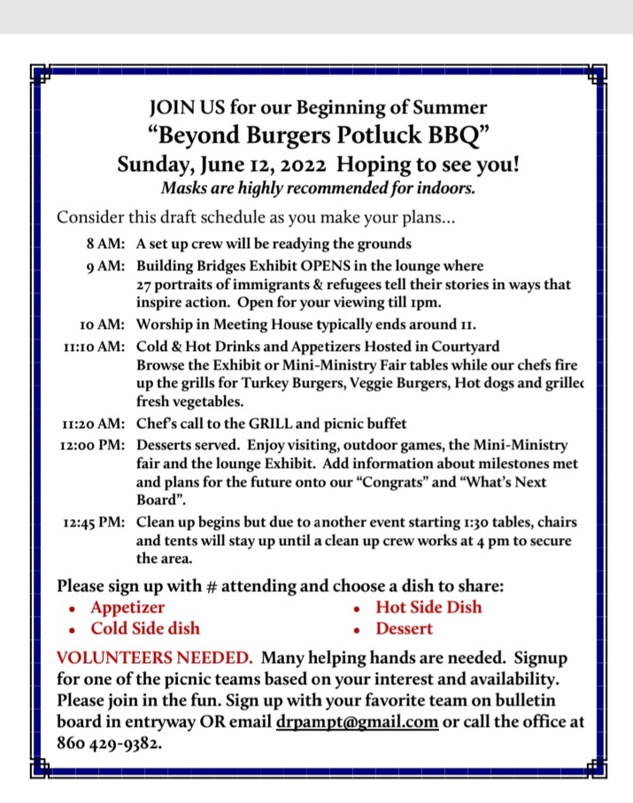 03Jun Beginning of Summer Potluck BBQ coming soon! Categories: News Sunday, June 12th after worship service. The Building Bridges exhibit will also be open for viewing until 1:00 p.m. Leave a Reply Cancel reply Δ