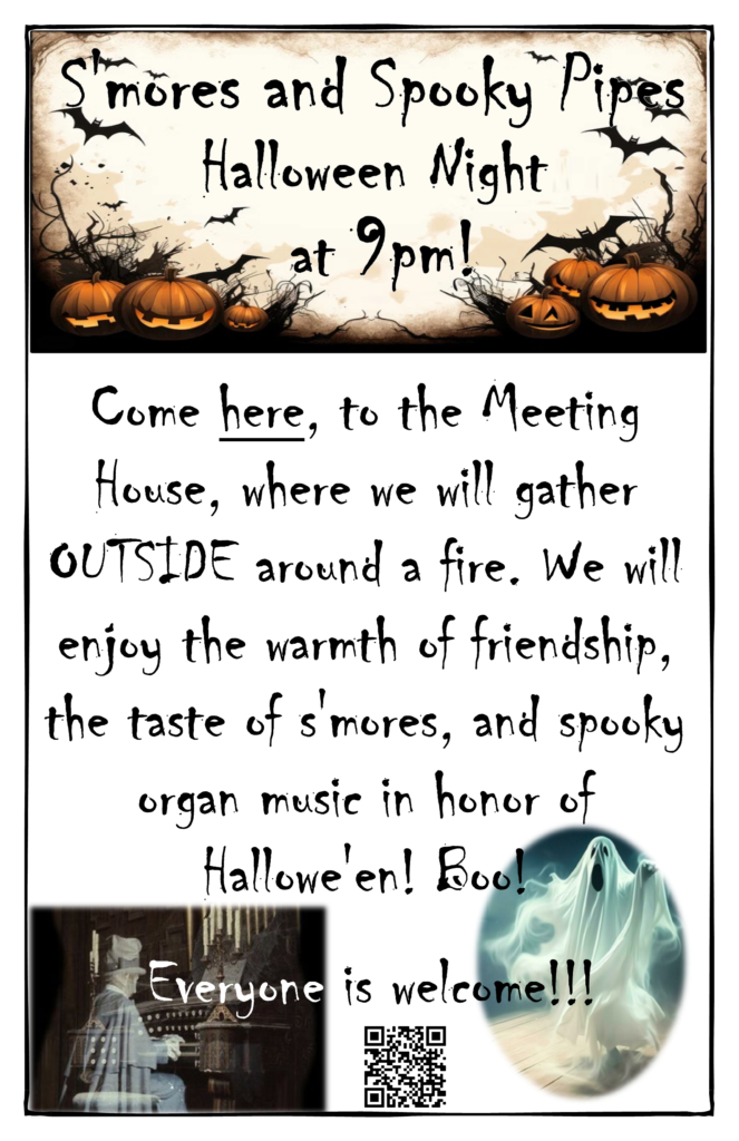 Come over to the Meeting House, where we will gather OUTSIDE around a fire (outside the Narthex, facing 195). We will enjoy the warmth of a fire, the taste of s’mores, and spooky organ music in honor of Hallowe’en! Boo!