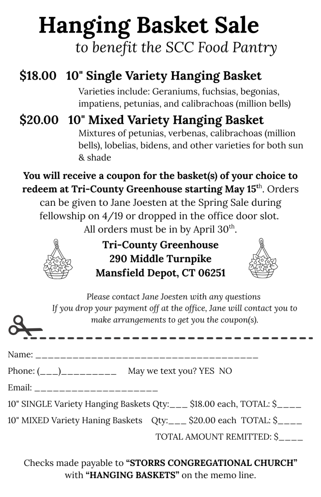 After service on April 19th, and up until April 30, we will be selling Springtime Hanging Baskets, to benefit the SCC Food Pantry! Beautify your porch or patio while tackling food insecurity! Print out the form below and drop it off in the church office. The Food Pantry appreciates your support!