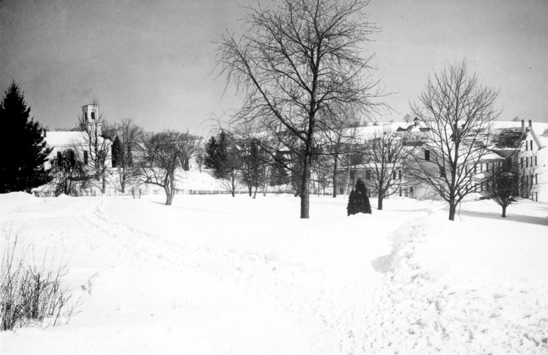 The congregation’s third Meeting House, built in 1848, overlooks a snowy scene in 1907. On the right is Old Whitney Hall, a former orphanage and first building of the Storrs Agricultural School, which today is the University of Connecticut.